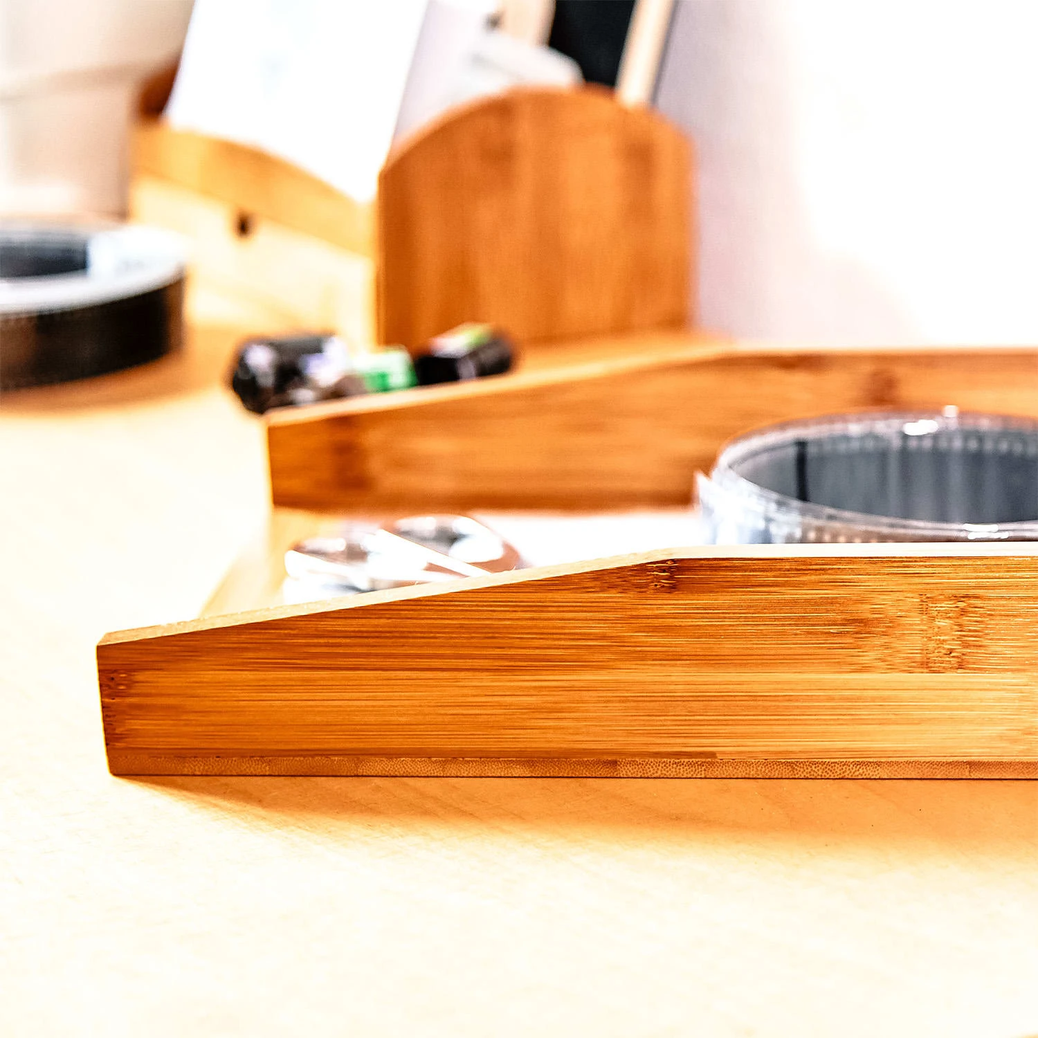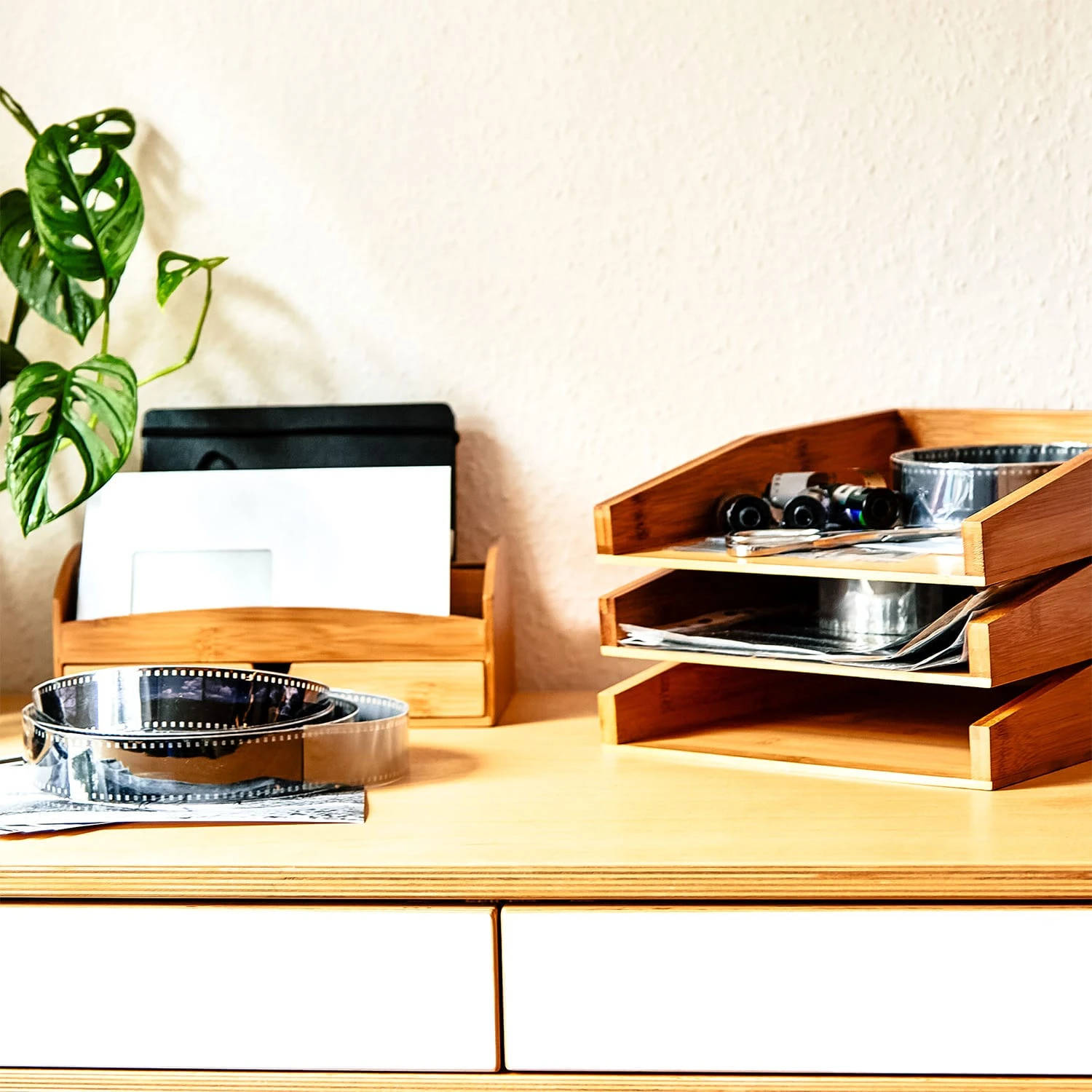 Verbannt Plastik aus dem Büro oder vom privaten Schreibtisch: Das nachhaltige Ablagefach aus Bambus von blumfeldt.