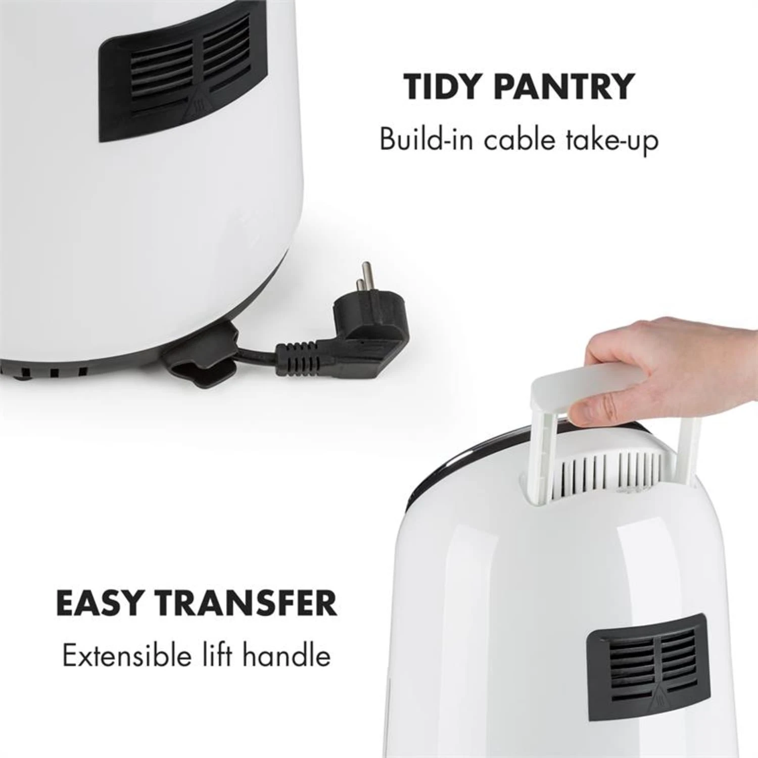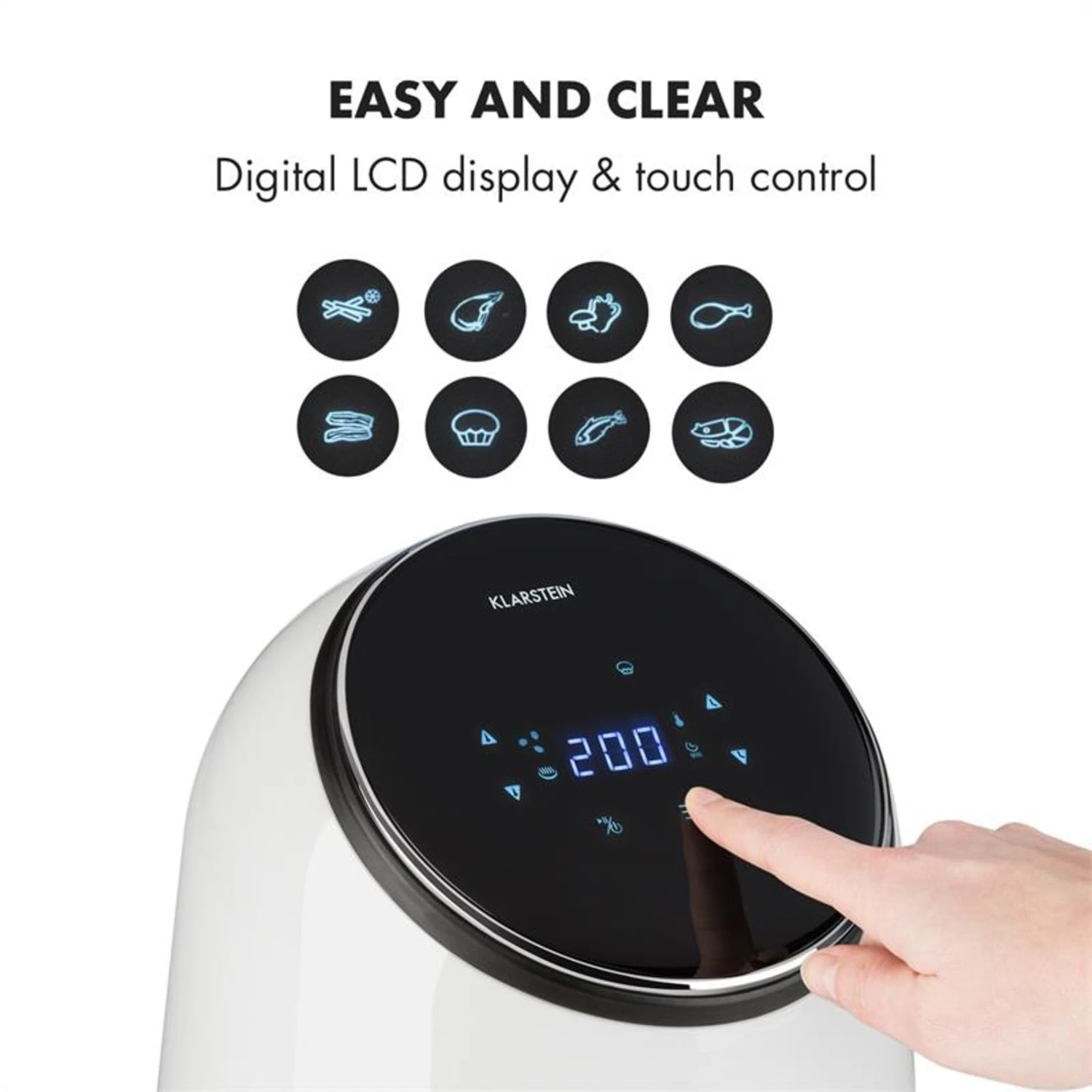 Rein mit den Pommes, fertig, los! Die Klarstein AirVital Heißluftfritteuse revolutioniert das bewährte, fettfreie Frittiersystem und bringt es auf neue Höhen des Geschmacks. Ihr 1300 Watt starkes Heißluftsystem arbeitet mit einem besonders ausgeklügelten Umluft- und Durchlüftungssystem und erreicht so die gewünschten Betriebstemperaturen in nur 3 Minuten. Per Thermostat wird die gewünschte Heizleistung in 5 °C Schritten von 80 bis 200 °C eingestellt. Dann noch den Timer minutenweise bis 60 Minuten programmieren und schön röstet die AirVital los. Wem das noch zu kompliziert ist, der kann auch einfach eines von 8 voreingestellten Programmen nutzen: Pommes, Bacon, Huhn, Lobster, Steak, Muffin, Pilze & Gemüse sowie Fisch stellen die ganze Bandbreite des Frittierens, Bratens, Grillens, Backens und Röstens zur Verfügung.