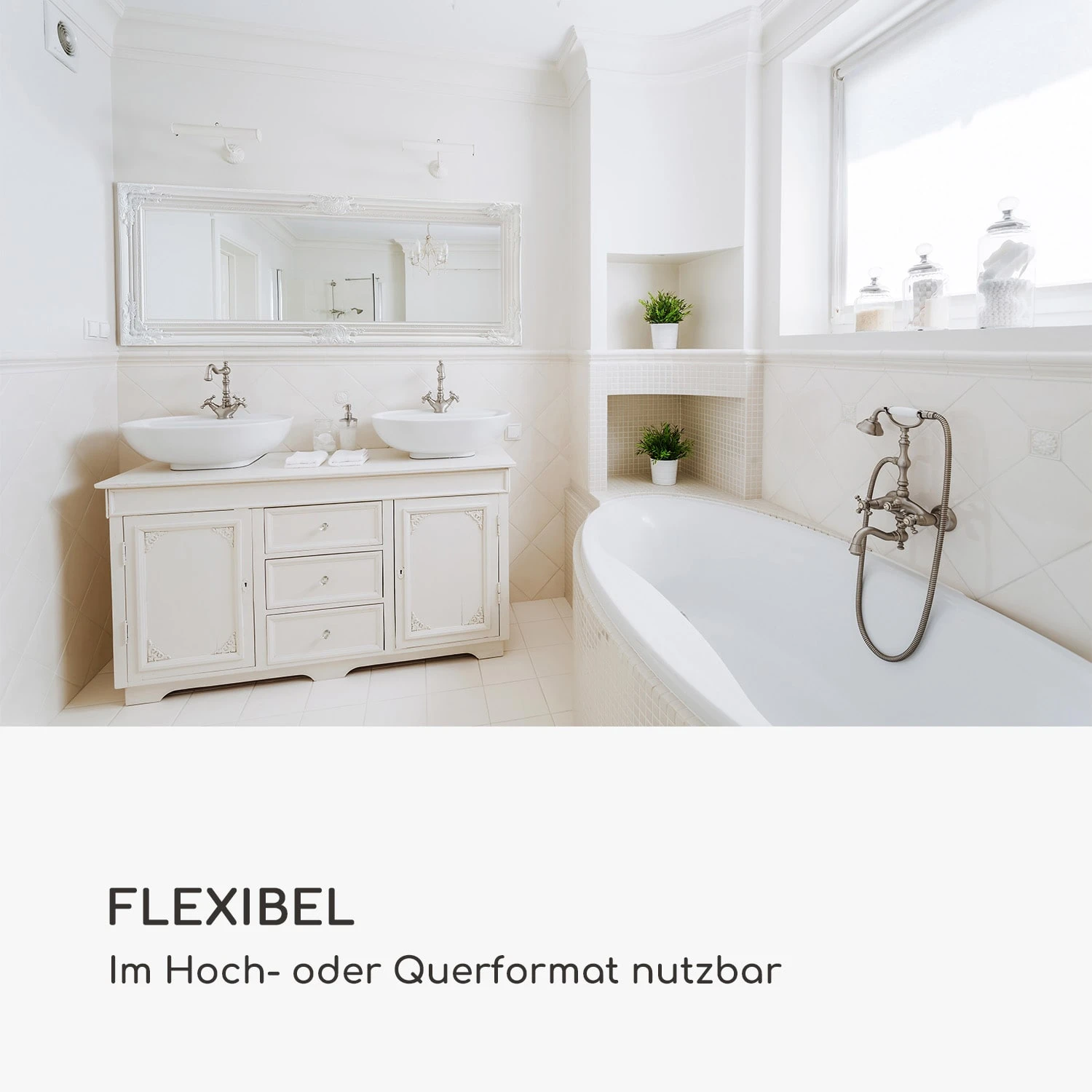 Durch einen Massivholzrahmen mit Gipsapplikationen verleiht der Ashford Standspiegel von Casa Chic by blumfeldt jedem deiner Räume einen besonderen visuellen Akzent. Mit seinem abnehmbaren Standfuß macht der Ashford nicht nur als Aufsteller, sondern auch aufgehängt jederzeit eine gute Figur. Der Spiegel mit Facettenschliff und Abmessungen von 130 x 45 cm ist besonders gut zur Verwendung im Hoch- oder im Querformat in Wohnzimmer, Badezimmer, Schlafzimmer oder auch im Flur geeignet.