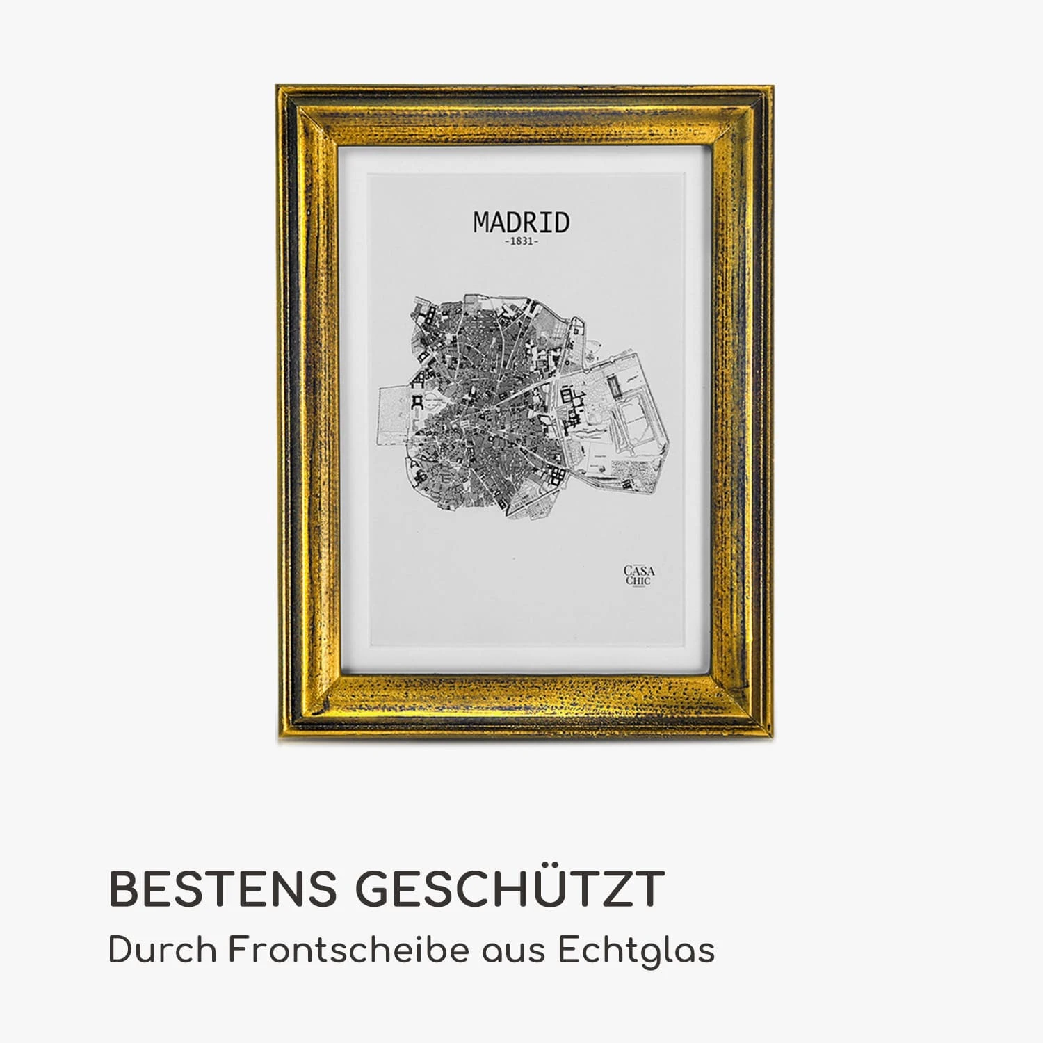 Jeder Rahmen ist ein Unikat: Der Lancaster Bilderrahmen von Casa Chic by blumfeldt aus edlem Pinienholz im Shabby-Chic-Look ist handgearbeitet und bringt deine Fotos und Bilder sowohl im Hoch- als auch im Querformat ideal zur Geltung. Bleibe flexibel und gestalte wunderschöne Wandcollagen oder arrangiere deine Lieblingsfotos auf dem Sideboard oder im Regal. Das mitgelieferte Passepartout überlässt dir die Wahl des passenden Bildausschnitts. Das gleichmäßig breite Rahmenprofil und die Frontscheibe aus Echtglas sorgen für Eleganz und besten Schutz.