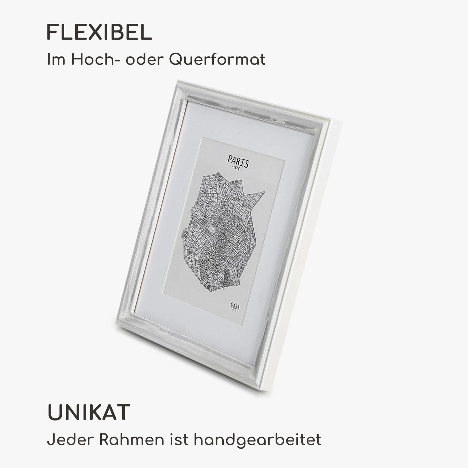 Jeder Rahmen ist ein Unikat: Der Lancaster Bilderrahmen von Casa Chic by blumfeldt aus edlem Pinienholz im Shabby-Chic-Look ist handgearbeitet und bringt deine Fotos und Bilder sowohl im Hoch- als auch im Querformat ideal zur Geltung. Bleibe flexibel und gestalte wunderschöne Wandcollagen oder arrangiere deine Lieblingsfotos auf dem Sideboard oder im Regal. Das mitgelieferte Passepartout überlässt dir die Wahl des passenden Bildausschnitts. Das gleichmäßig breite Rahmenprofil und die Frontscheibe aus Echtglas sorgen für Eleganz und besten Schutz.