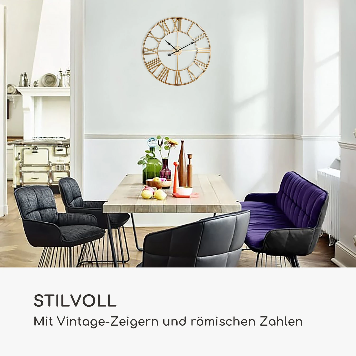 Die Queensway Wanduhr von Casa Chic by blumfeldt mit römischen Zahlen verleiht jedem Interieur eine besonders wohnliche Atmosphäre. Der elegante Metallrahmen mit Vintage-Zeigern macht sie perfekt für jeden Raum, vom heimischen Wohnzimmer über Büros bis hin zum gemütlichen Café oder Restaurant. Die Kombination der leichten Metallzeiger und des hochwertigen Quarz-Uhrwerks ermöglichen eine genaue und stille Zeitmessung! Dank ausbleibender Tick-Geräusche ist die Uhr auch perfekt zur Nutzung im Schlafzimmer geeignet.